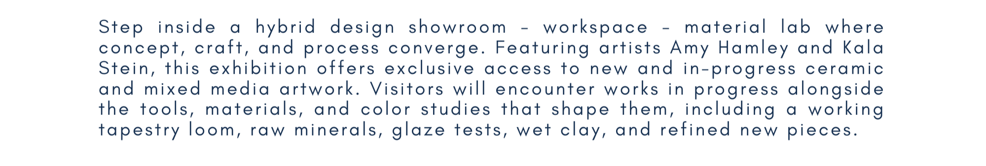 A solo exhibition of ceramics by Kala Stein mapping themes of climate and place through experimental design, fire, and flux studies. Exploring motifs of water, fragility, and changing landscapes through vessels and wall art, Stein considers the ceramic process a metaphor for geologic and climate change. She uses the kiln to simulate geologic transformation including cracking, melting, flow and fluxing. Stein explores the wonder of ceramic material, the love of being near water, and laments negative impacts of the Anthropocene Epoch. By leveraging the inherent fragility of ceramics, a theme emerges that contemplates the sublime, being and loss within the context of climate change in Northern California.